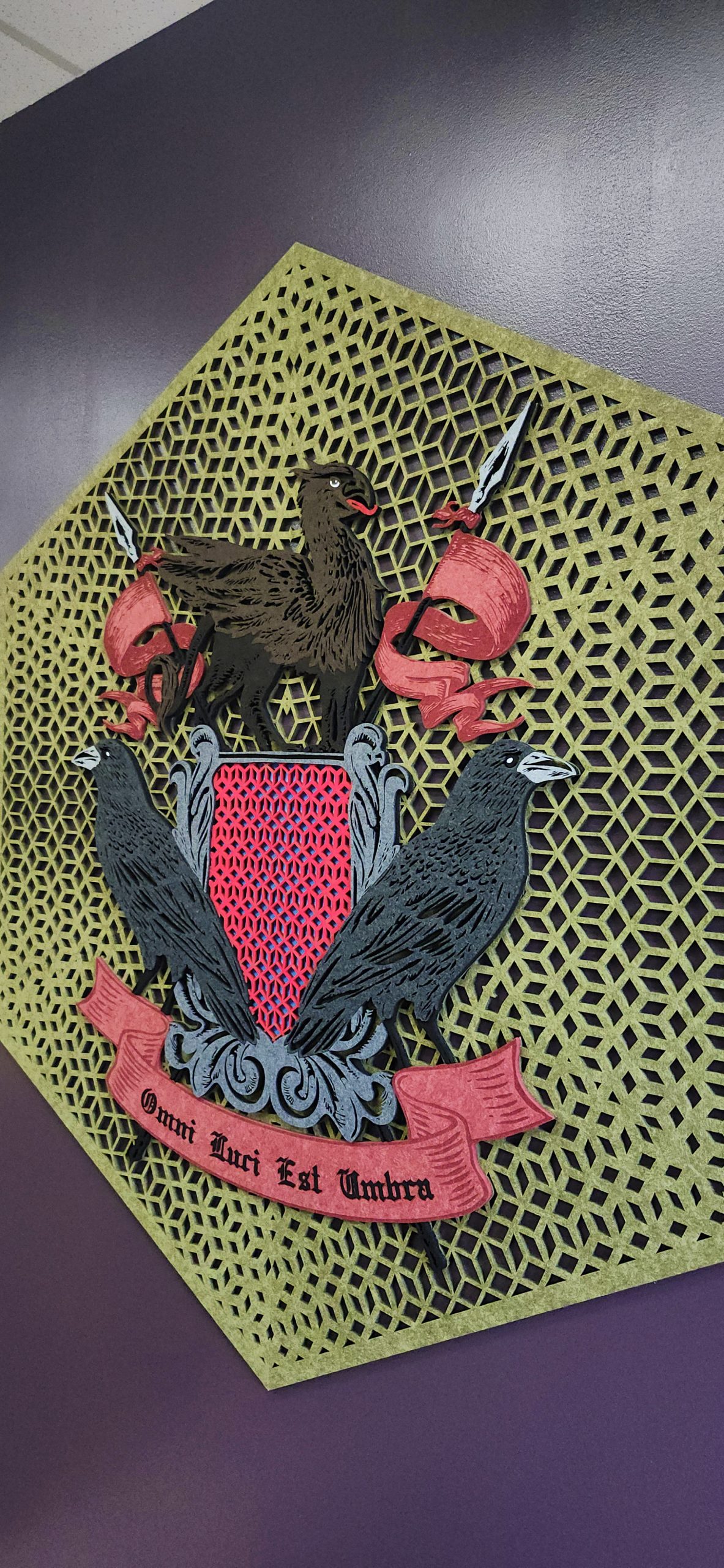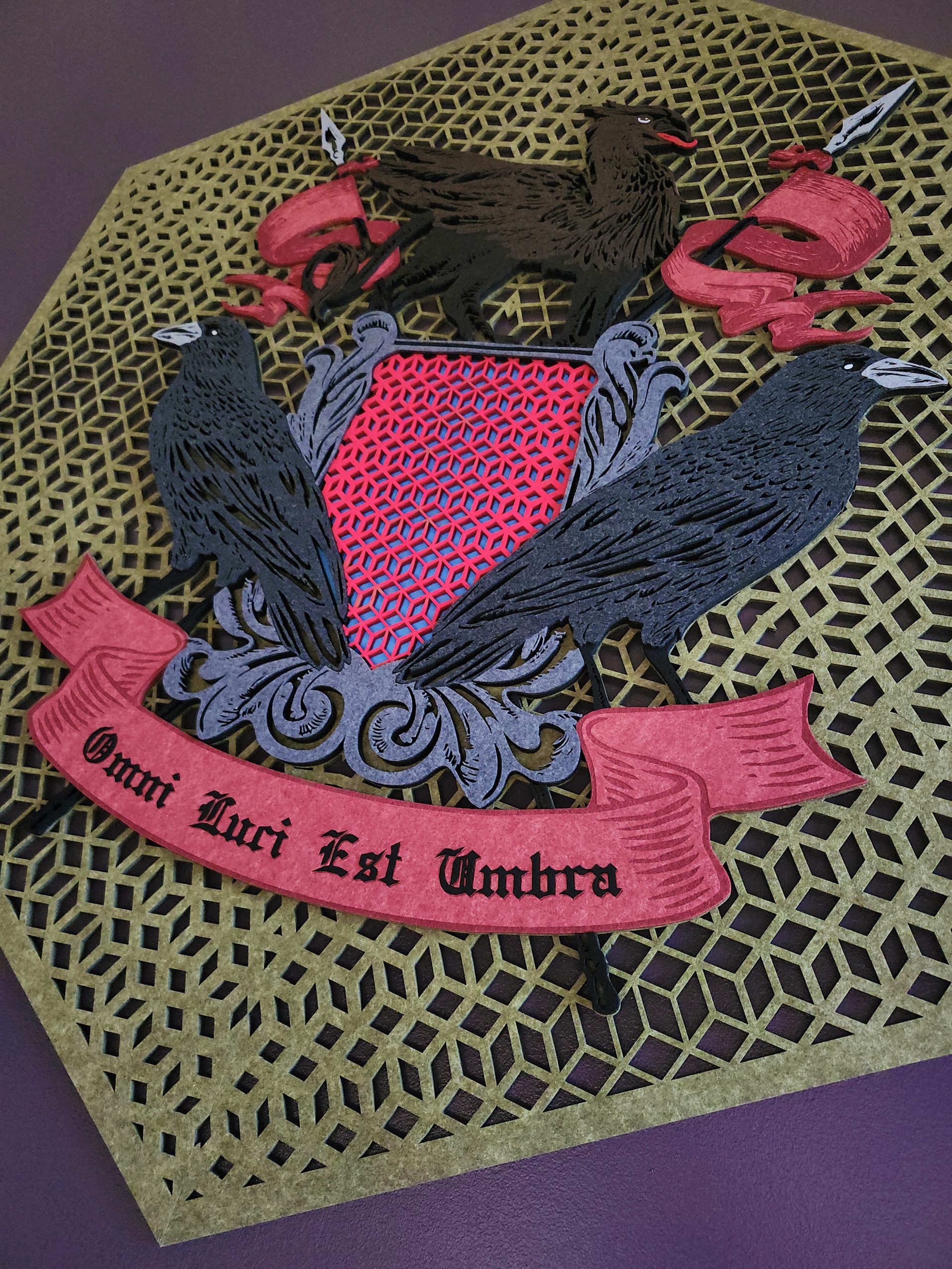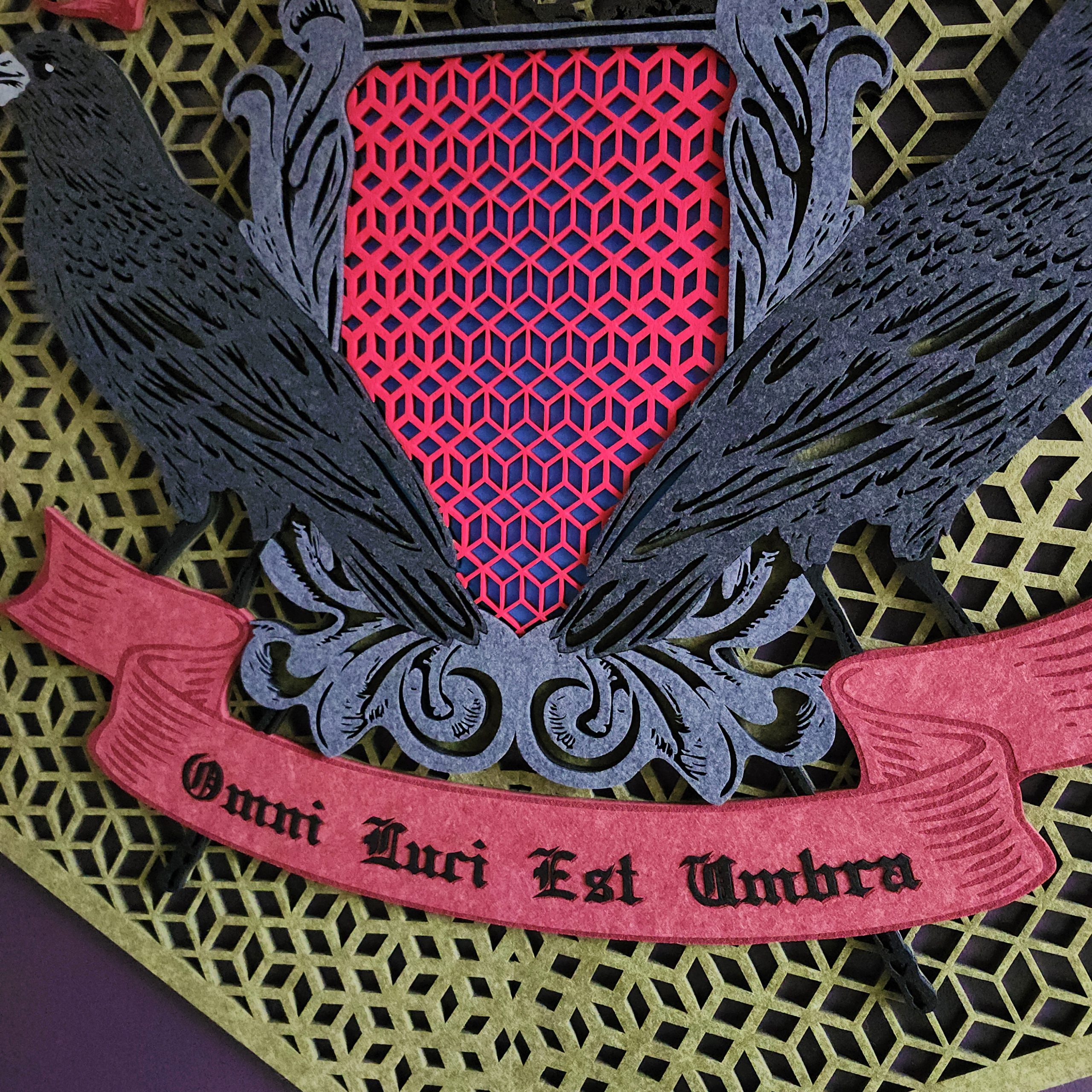 Intricate Detail: From the “Omni Luci Est Umbra” Latin banner to the geometric lattice, we can execute cuts that would be physically impossible with a blade or die.